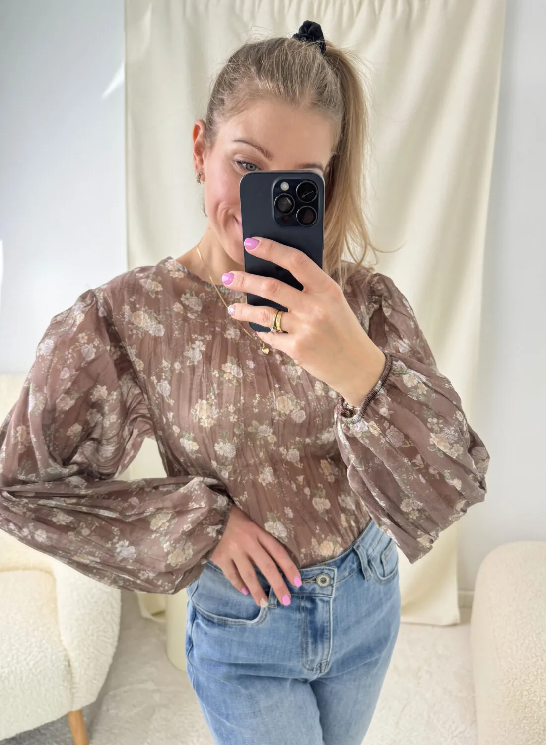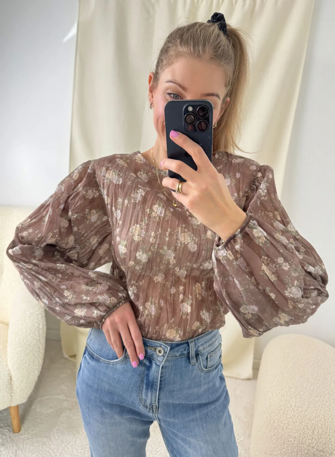 Piękna i bardzo efektowna bluzka z odpinanymi różyczkami na nadgarstkach. Bluzka jest elastyczna. Posiada marszczenie na przodzie.